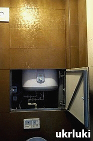 Итак, первый и самый частый случай применения двухдверного вертикального люка для того, чтобы спрятать бойлер. В этом случае одна из створок люка предназначена для частого открывания, а вторая вообще может быть законсервирована затиркой для швов с тем, чтобы открыться когда это будет необходимо для ремонта или замены бойлера.